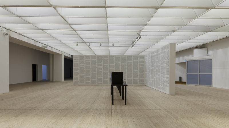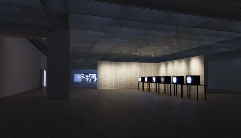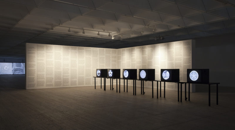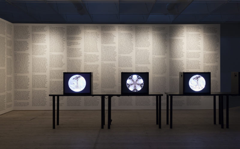 These thoughts come to mind, somewhat excitedly, at seeing some images from SPEED 2, an art exhibit at Malmö Konsthall, Sweden, which ran from 3.16–5.26.2019. Featuring new commissioned works by James Richards and Leslie Thornton, the show also included related works by other artists, including Vi Khi Nao, a Vietnamese American writer and artist whom we’ve featured frequently on diaCRITICS as we find her work (as well her in-depth interviews with writers) to be spirited, unexpected, and incomparable. So it is a thrill for us to see the text of Sheep Machine (Black Sun Lit, 2018), her book-length ekphrastic poem based on Leslie Thornton’s video art, displayed in its entirety, in wall-spanning columns, in conjunction with the videos by Thornton that the text “narrates”. To learn more about this unique poetic gesture, you can read the review of Sheep Machine by our book reviews editor Eric Nguyen, published earlier this year. As Eric reflects in the review: