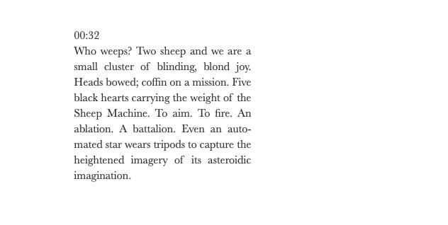 This moving image and text installation combines Leslie Thornton’s video work Sheep Machine (2011) with a dedicated poem by writer Vi Khi Nao (Black Sun Lit, 2018). One set of videos show sheep feeding in a field as a conveyorbelt of cable cars ascend and return from a mountain in the Swiss Alps. The other, a digitally manipulated and pulsing kaleidoscope, is a refraction of the same shot. The work draws on the long-running fascination of Thornton with the logic of mechanised violence, and the conveyor belt as metaphor. In her poemand response to this work, Vi Khi Nao has exploded the first three minutes ofThornton’s video into one second fragments. Each stanza is structured along a time code, such as ‘00:00 Pitch-black,’ ‘00:01 This is wheat & grass’, each section a different reflection on ethics, animals and machines.